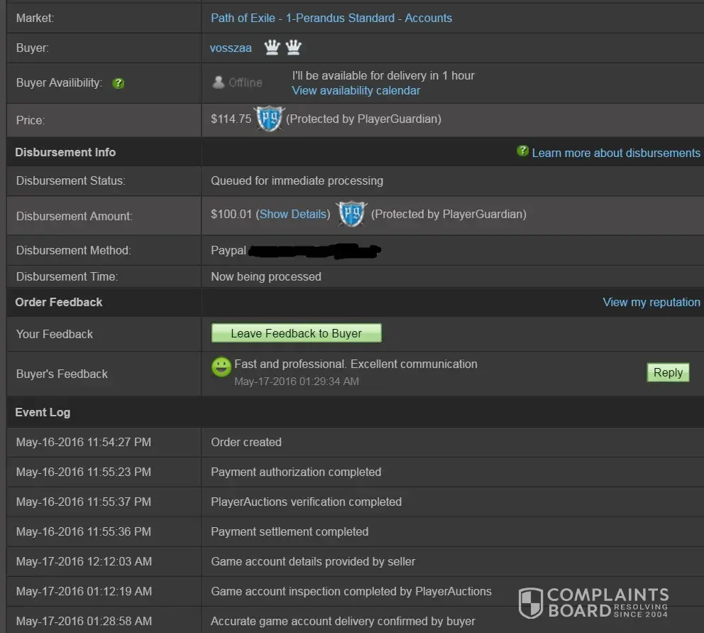 I will start off by saying I have done a few thousand USD in transactions on Player Auctions and they went smooth. It was on my most recent transaction where I ran into serious issues. I sold a World of Warcraft account for the $150-200 range and was to receive payment in the $100-150 range. The payment was never disbursed to my account.