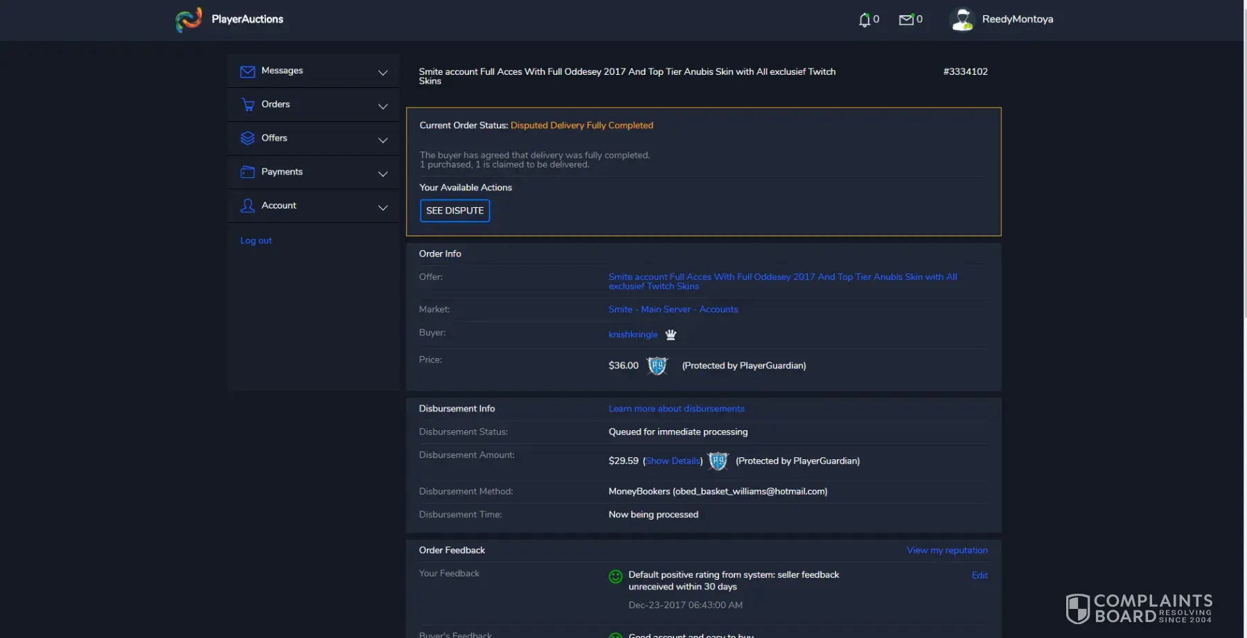 I had been purchasing and selling on player auctions with out problem for about a year. I had purchased an account in Feb from player auctions. Last week I placed a sell ad on playerauctions. a buyer had purchased it. so the money goes to playerauctions. Then I sent the account information to playerauctions so they could inspect the account to make sure everything is as I posted it on their site. then once playerauctions inspect it they release the account information to the buyer. the buyer then uses the information to open the account change the information so that the seller no longer has control over the account. Then the buyer is to confirm the delivery. Then playerauctions is to release the funds to the seller. Instead of the transaction happening just like that. The buyer took over control of the account and then filed a dispute stating it was his son who was the buyer and without his knowledge he used his credit card and he wants a 25% discount stating there would be extra cost to the buyer to transfer characters to different servers on the account. I filed back a dispute saying there wouldn't be a discount because those added costs are expected. Then the buyer refiled stating he could no longer access the account and wanted a full refund. Playerauctions is giving the buyer a full refund. I am receiving nothing for my account and no way I can get my account back from the buyer because I wasn't the original owner I had bought it from playerauctions in Feb.