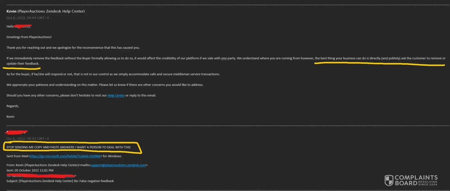 Another issue is where the verification system is Playerauctions is terrible a buyer had to spend 1 hour to verify to buy the account, they send gave me a Neutral review which is neutral as it takes away your positive feedback rate? I tried to contact the buyer and they threatened me and said they would make the feedback worse if I tried to contact them again, Yet I am trying to explain to them that the issue isnt my fault and I had no control over it. Anyway I try and contact support and 9 MINUTES LATER "Kevin" responds saying for me to try and contact the buyer to remove it yet I stated in the support I tried to contact them and they threatened me. Clearly this "Kevin" is a bot and the situation is not being handled by a real person.