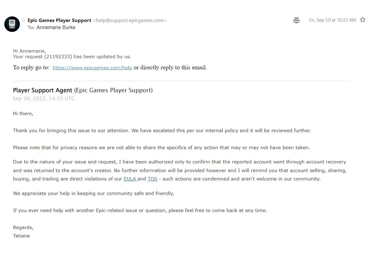 "Due to the nature of your issue and request, I have been authorized only to confirm that the reported account went through account recovery and was returned to the account's creator. No further information will be provided however." (his reply to this made no sense because he said 'The evidence we received is that the account was "not found"; the email was changed, but this email change does not point to the seller and it could have been any party.' which he knows is a lie. DO NOT TRUST PA! They will not honor their protection and you literally can't get them to side with the buyer even if you provide proof the seller reclaimed the account. Then they come on the review sites and make untrue claims about your case.