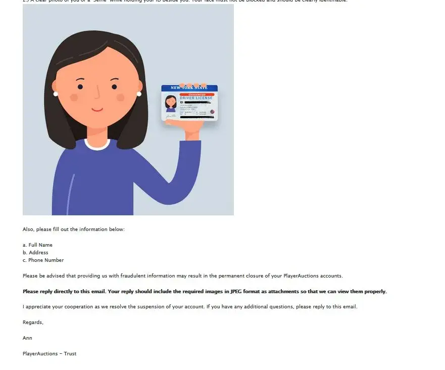 Please be advised that providing us with fraudulent information may result in the permanent closure of your PlayerAuctions accounts.