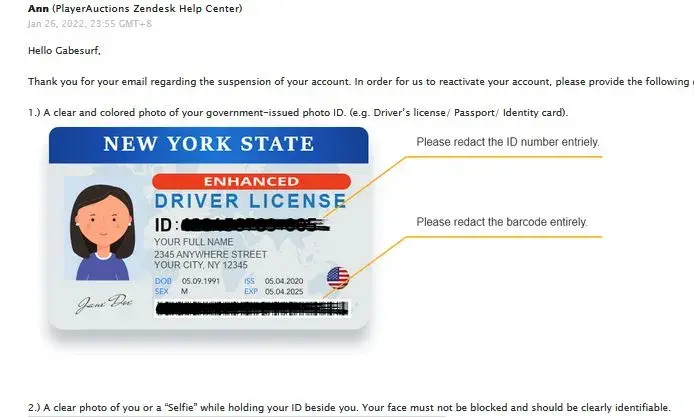 Continue to have issues with PlayerAuctions email support. Very poor clarification in emails and the best explanation unfortunately after about 8 emails later has been from Richard on this posted complaints board. Again I want to stress they are asking for your driver's license and photo of yourself, email, address, and phone number all over conventional email! I Cannot get clear responses from the staff and there is no chat feature or phone number. I'll never do business with this company will post my experience to other sites as well.