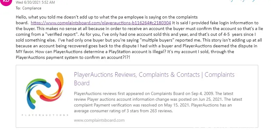 I received a response from trust compliance through email and what they told me is different from what you're telling me. If PlayerAuctions is going to lie at least make sure everyone is on the same page. If you look at the images the PA employee states I've been reported by multiple buyers claiming their account was recovered or hacked. I've had only one buyer and this is literally out of 4-5 years. Only one buyer has done a dispute claiming I stole the account back. I submitted proof and PA resolved the dispute in my favor. This dispute started at the beginning of May and ending the middle of June. How can PA claim I'm selling illegal PlayStation accounts when it's my own account and the account in question had a dispute that was resolved in MY favor?