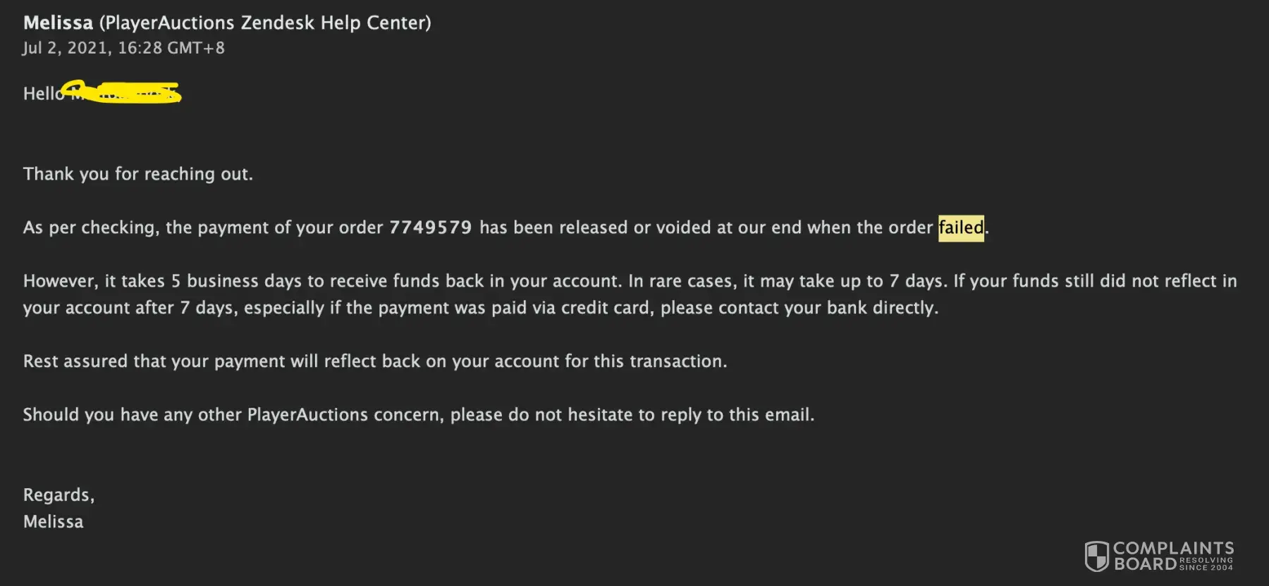 Thank you for your reply. So the reason there was a chargeback filed was because I had a payment failed on one of my orders. Upon this payment failure, I contacted Player Auctions Support. The person who I spoke to was Melissa. Melissa stated it could take up to 7 days to go back to my account. Melissa also stated if it was not in my account after 7 days, to contact my bank. THAT is why I contacted my payment provider. This was for order 7749579. Seeing as how I was charged 3 times for the same exact amount (2 charges were correct, 1 was not) my payment provider was unsure of which one to dispute with PA so they chose one at random I guess. Nonetheless, I was told by PlayerAuctions (Melissa) to contact my bank after 7 days if a refund was not received, AND THAT'S WHAT I DID.