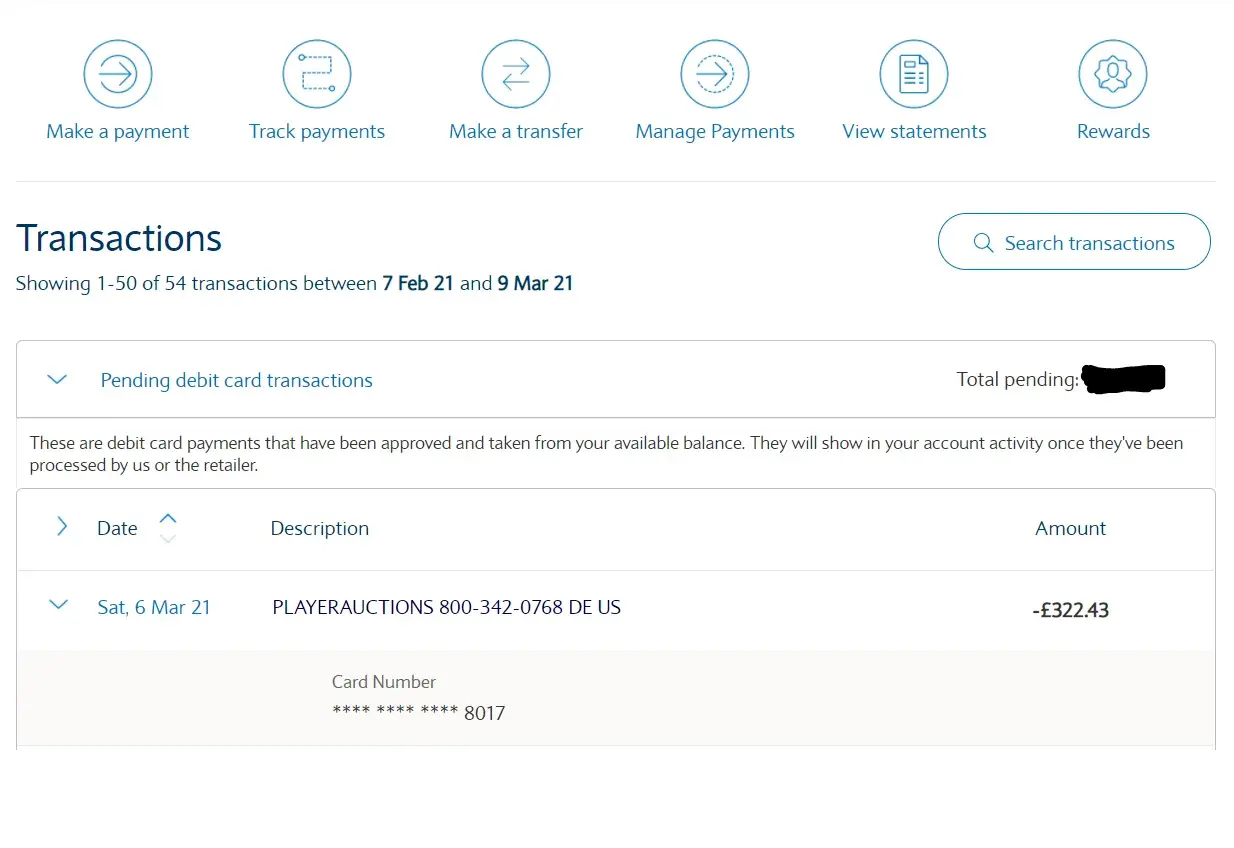While checking my online banking, I found that I was charged £322.43 as "PLAYERAUCTIONS" as a merchant on Saturday 06/03/2021 at 11:47 AM (England Time).