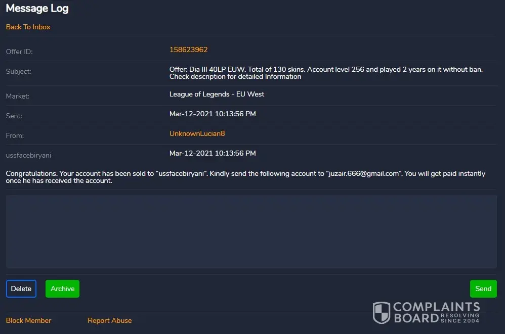 I received a meesage a week ago where I noticed that my League of Legends account has beed bought by someone and that I need to change my game account to the buyers email. As soon as I did that I haven't received my money (in the amount of 130$) and I lost the access to my League of Legends account. It's been a week and I haven't received my payment.