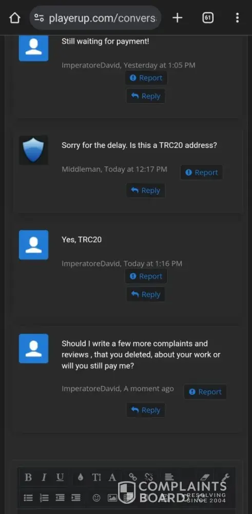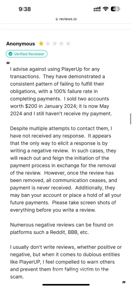 If you use Middleman services, they will waste your time, make your experience so miserable and you'll never get your money, ever! After selling my very old high quality Reddit account (+500k karma!) I have been waiting for over 2 months for them to process my payment. Initially I provided them with my PayPal information and ID, but after ignoring me for over a month, I provided 2 more payment options just in case they may have delays with PayPal. I kept asking for payment status about once a week (via PlayerUp pm, forums and Telegram) and didn't get a single response from Middleman or staff for weeks! The worse thing is "last seen 1min ago" every day I log in which means they are deliberately refusing to pay me, that and the fact they banned my posts on the forms without any feedback (my posts shows 0 visits and don't appear for me when logged out)... After I finally decided to kiss my money goodbye and wrote a bad review here, the Middleman messaged me immediately (like within 1min lol) on Telegram, he basically demanded that I delete the negative review in order to get my payment, and he made a bold claim that "my mixed payment options caused delays". Are you freaking kidding me? Still, I gave them the benefit of the doubt because 1) I need my large sum of money. 2) Middleman confirmed they finally have all needed information and that my payment shouldn't take more than 96 hours... Needless to say, that was a lie too and just an attempt to stall me even longer... And btw, the Middleman will reduce your payment again and again. If you sell an account at 1000$, the Middleman will offer you 700$ if you're lucky, and if he has to reissue you a new cashout link (which they did for me), they will reduce again to an amount they see fit... In conclusion, please don't make the same mistake as me and never give 2nd chances, they will only provide you with false hope and waste your time and energy for nothing... I logged in multiple times a day just to check if I got my payment and I was sad to see none... (Middleman, don't even attempt to fool me again into deleting this review, I won't! In fact I will write on 4-5 different places unless you give me my money, today! Also feel free to ban my account on the forum because guess what, I don't want to ever use it again!)