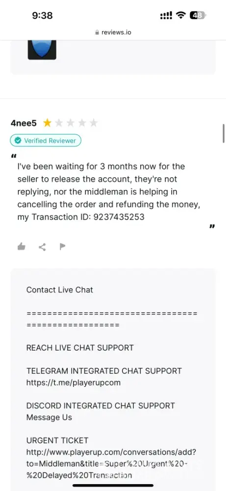 I am extremely disappointed with PlayerUp. Despite being assured that my issue would be resolved within 72 hours, it has now been over a month with no response from their middleman service. After extensive research on various forums and websites, I discovered that PlayerUp has numerous negative reviews and feedback. Many users have reported that they never...