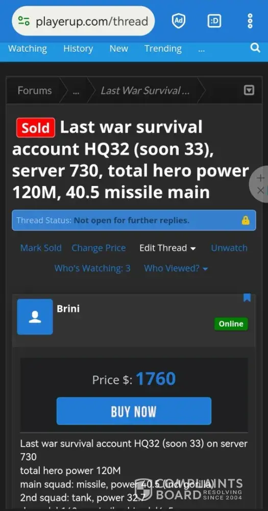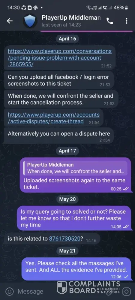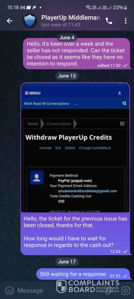 I sold a 7ds grand cross account over 1 year ago and till this day i havent received my money from playerup messaging them everysingle day on telegram always saying youre issue will be resolved but its been 1 year and nothing has been resolved all this for 95usd, sended them the paypal invoices they asked for nothing ofc, oh and forgot to mention they always go radio silence after you message them on telegram.