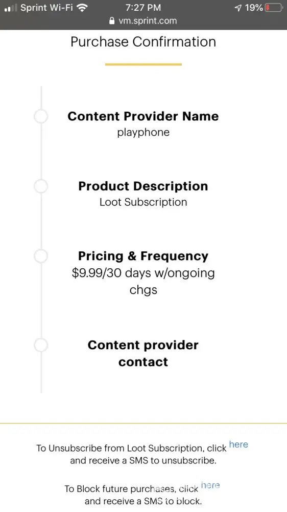 I received a text message from Sprint this afternoon stating that I had purchased $9.99/30 days with ongoing charges with a link to click. The link shows e that I am paying for a playphone loot subscription with a link to unsubscribe but no way to get my money back. I didn't buy anything and have no idea what this charge is for. I want a refund now