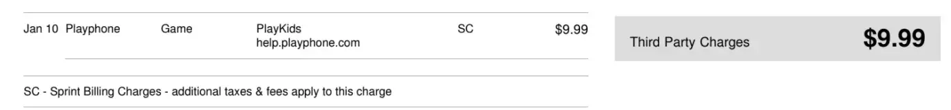 A charge of $9.99 showed up on my Sprint's December, 2020 bill claiming to be Third Party Charges of some game from playphone.com, which I have no idea when or where I played in my phone.