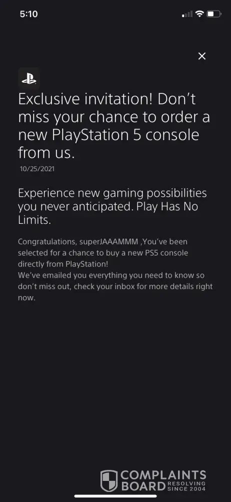 Recently I entered a draw for a chance to purchase a PS5 console directly from PlayStation. I received a message from the PlayStation app informing me that I've been selected to purchase a PS5 (image attached). There was no email received to make the purchase so I attempted to contact PlayStation for assistance. The webpage is designed to keep customers from engaging with live support reps and instead redirects customers to various FAQ pages. After locating a number to call, and after waiting to speak with a rep I was instructed to visit psdirect.com/chat to chat with the correct team. This chat window also redirects customers to various FAQ pages but after some persistent searching I was able to locate the window to chat with a live representative. After explaining my problem to the rep (Rachael), I was instructed to re-enter the draw, and then I was encouraged to enter future drops before the rep killed the chat before I could copy the transcript. I've attached what I was able to copy from the transcript before the chat was killed by Rachael.