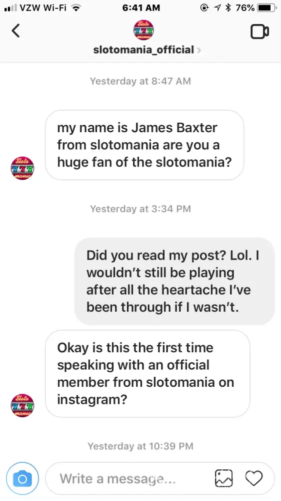 I received a message from James Baxter who claims to be an official from Slotomaniaâ„¢ on my Instagram account. After seeing that he has tried to pull other tricks on people I feel that you should be aware he contacted me. He has yet to offer me the world, but I feel that it is only a matter of time. I told him in my last message that I reported him.