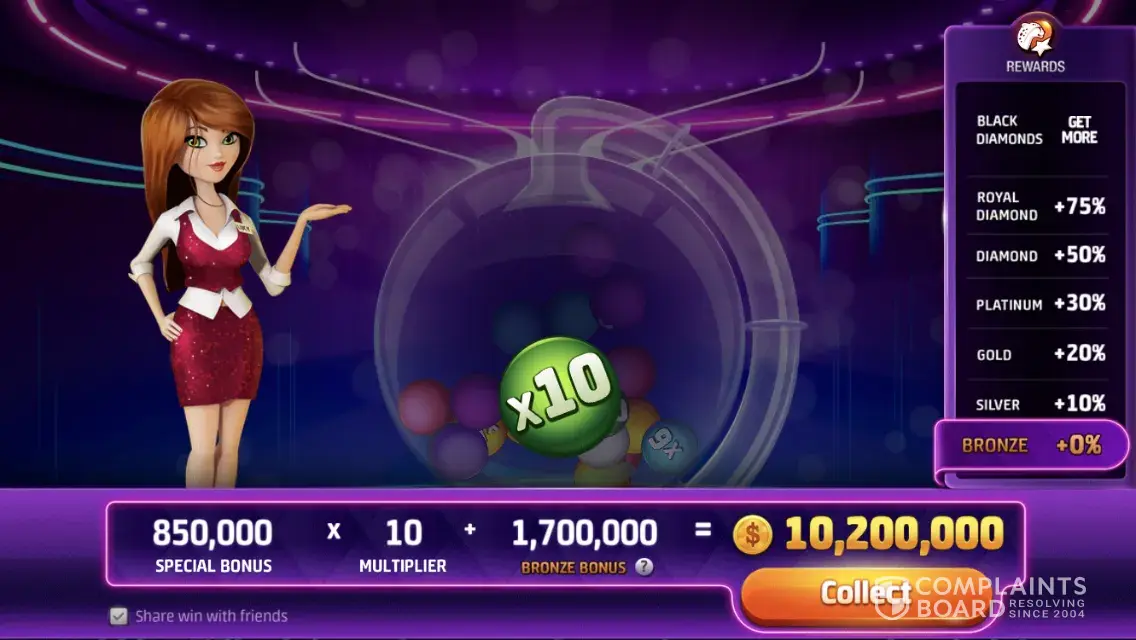 I played the mega bonus and got the black wedge but it said my rewards level was Bronze. My level is Gold. So I didn't get any extra coins. Also I played the Smash or Pass in Smashomania. I was betting 18, 000, 000 and I got to the end with D and N left and I choose to pass where the reward was 750 but the game froze and reset and I got no coins. The bonus game didn't restart. I bet a lot to get to that point.