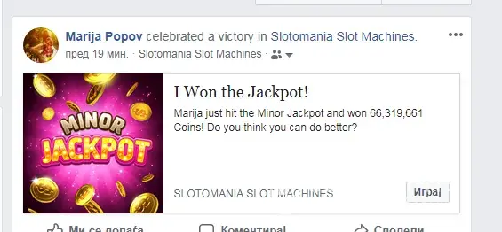 On 07 August about 5:30 PM Central Europian time, I have earnt 64 billion coins in Minor jackpot in game 3 Mustangs, but Slotomania didn't add that coins to my account. I shared the win on the my wall on Facebook profile, and I'm sending the photo as attachment.
