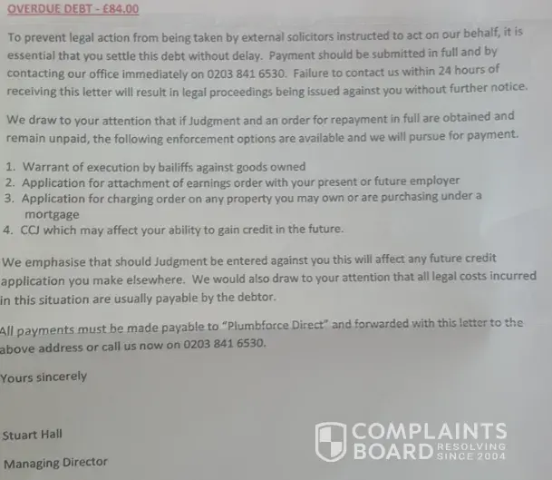 We booked them on 5th February and they agreed to come with a fixed price of £70 + VAT no matter how long it will take and if there's any parts included they would not charge any extra. So, the whole work is £70 + VAT. When the so-called plumber came, he did not even try to look at the leak, which we reported. Straightaway he said the whole toilet needs to be replaced and the cost would be around £250 + VAT. At that point we said no we don't want to as we know that it was not the toilet it was the pipe next to it. The "plumber" was in the house about 10 min and left and said that we need to pay £70 + VAT, which we said no, you didn't even look at the leak, so you are charging us ! Then their office called and threaten legal action, and all sort if we don't pay. We ignored it. 6 days later the later came with the threat.
