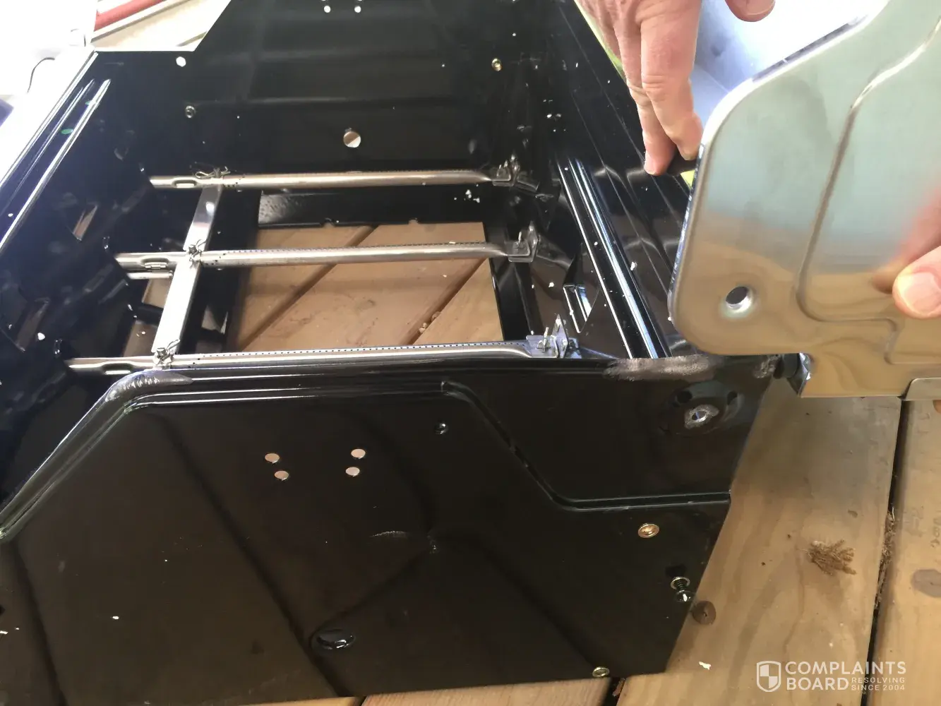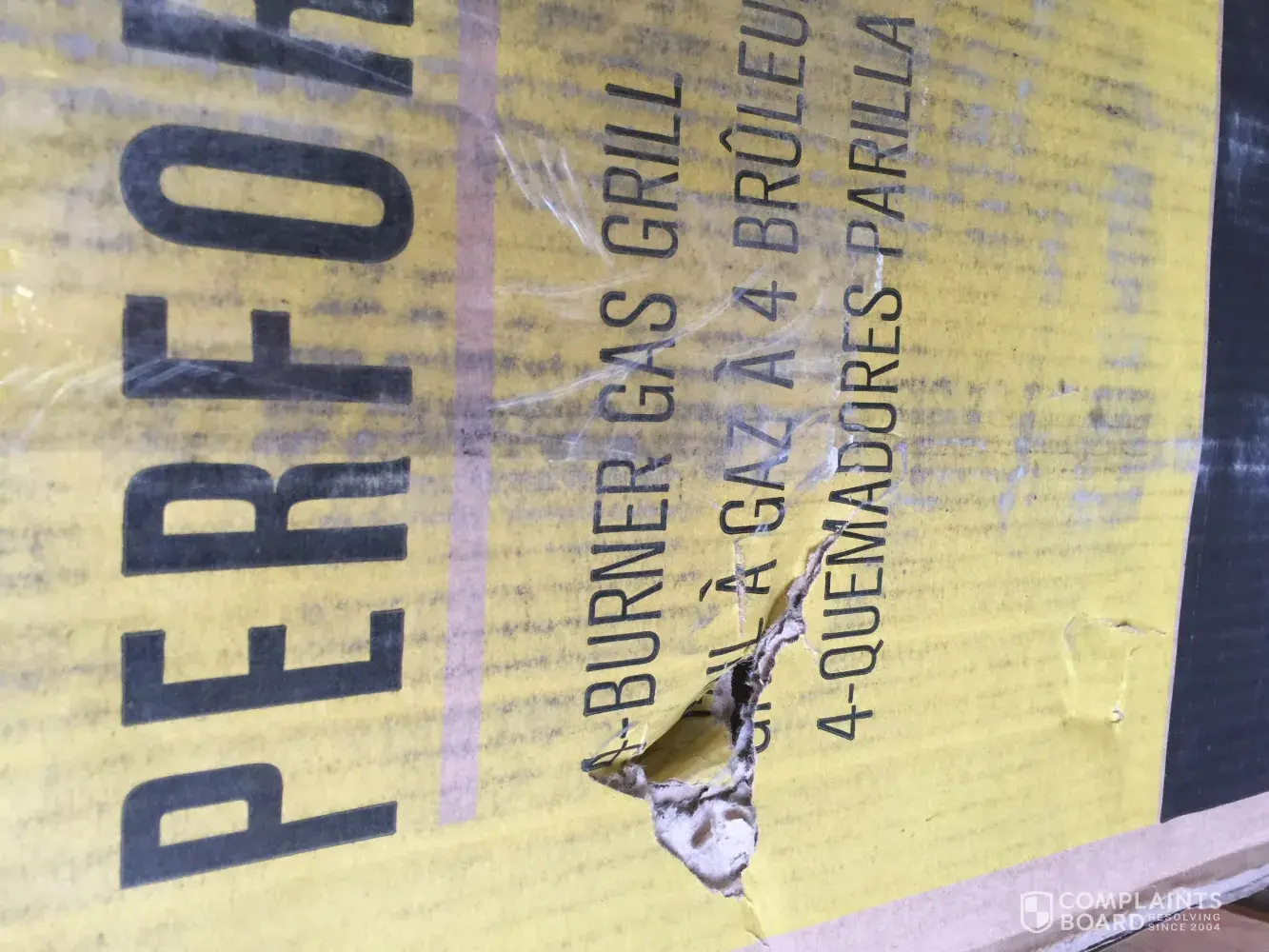 The grill was delivered upside down, in a disheveled box with packing tape wrapped around it to hold it together. When box opened for assembly, there was a bolt missing on the right side hinge. The bolt was not located. There is damage done to the area around the hinge, the metal is bent. There are scratches to the grill top.