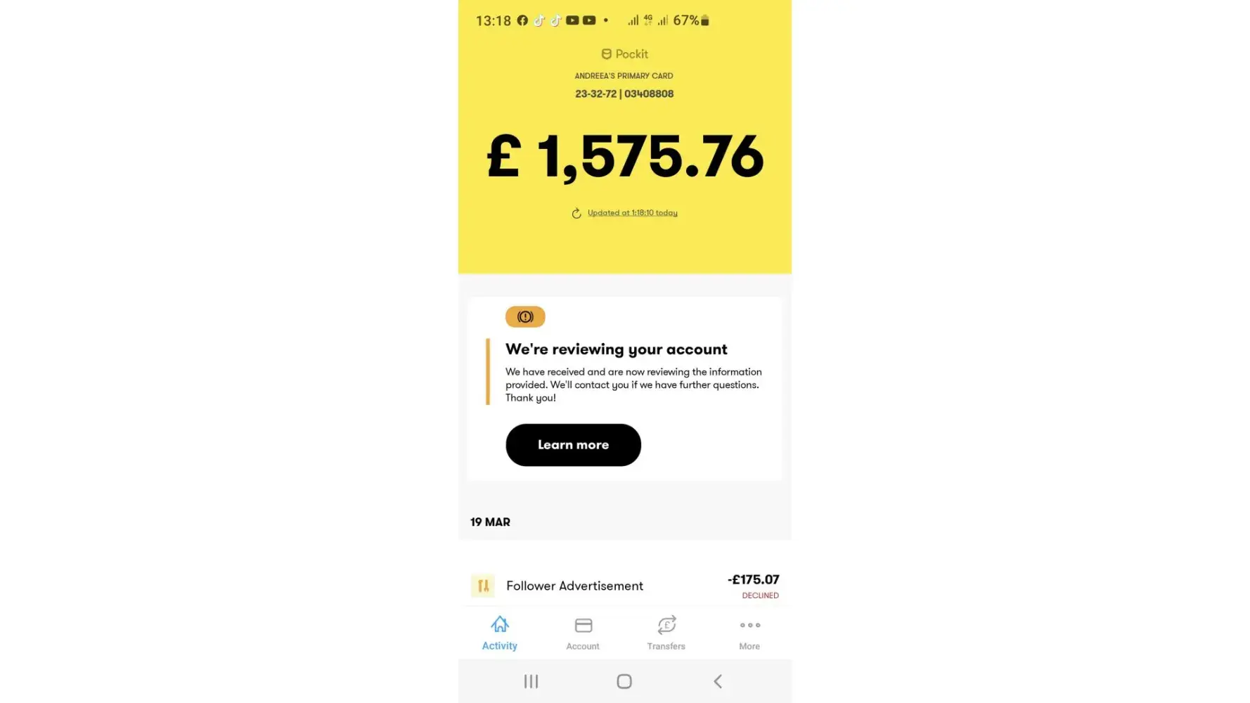 I've been with pockit for 3 years and they have now suspended my account asking for verification no phone not answering emails every thing is robots this is not right I can access my money this is my money not yours. Then to find out pockit is run by Pakistans and only 2 in office and not replying to anyone and also to find out they have been selling my details if u look in to your payees on Internet banking not app it shows they have been using my account to set up direct debits to 7 differnt country's Ukraine Pakistan this is not bank account guys if u have been with them it will eventually happen to u as they are fraudulent your accounts for there own personal uses then they hold on to your money and ask for more information don't fall for it any company that holds your money finicially should have contact number they are falling on vulnerable people guys please listen to me Read Less