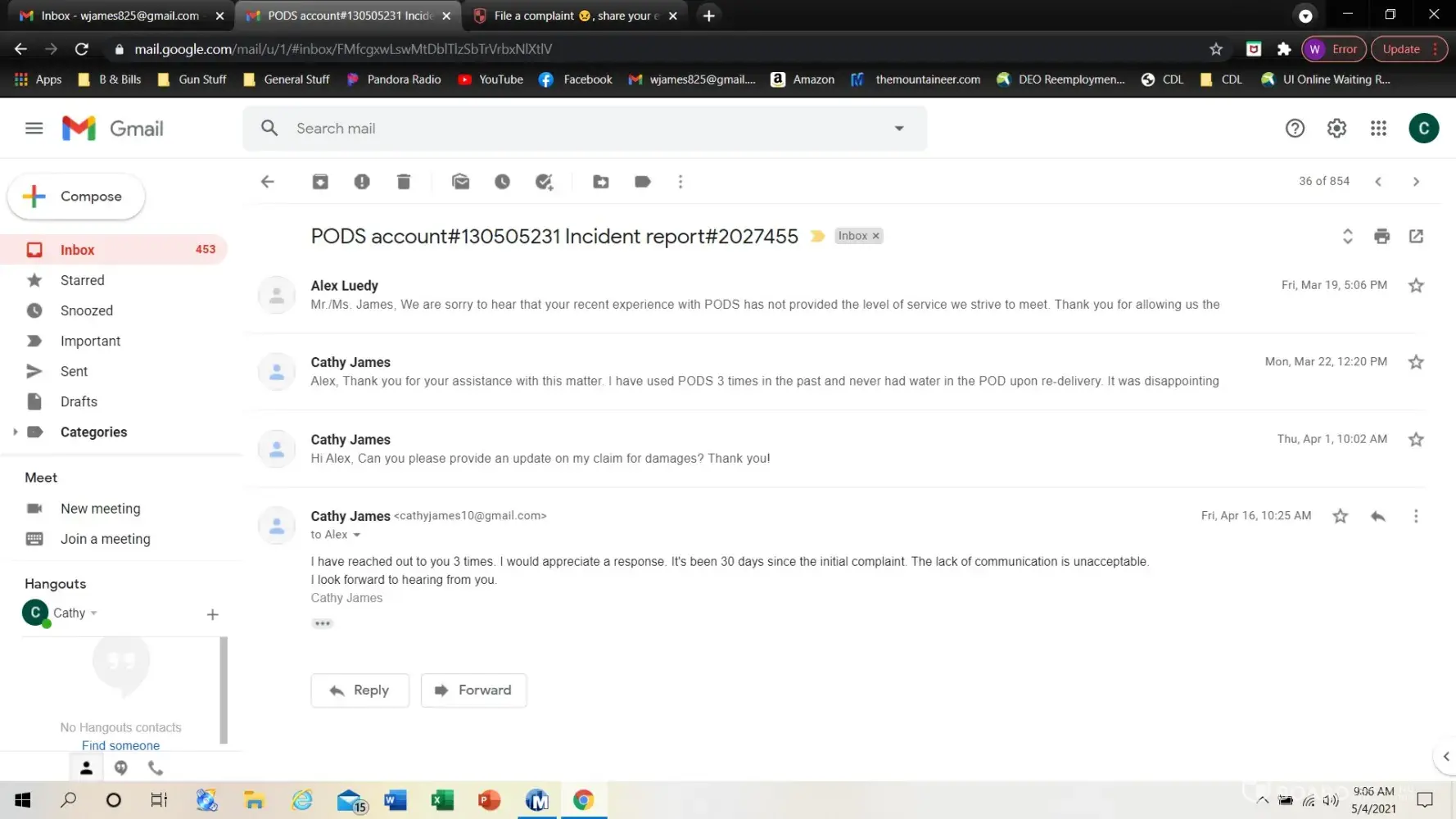 The next day, July 21st I contacted the Pods company through their 800 number and was assigned an Incident Report number 2102058. I was told that I would be contacted in 48 hours. That contact was not made. I called the Pods several times a week, requesting escalation to decision makers. After pushing politely but firmly, we received the first contact from a Customer Advocacy Specialist on August 10, 2021 in an email.
