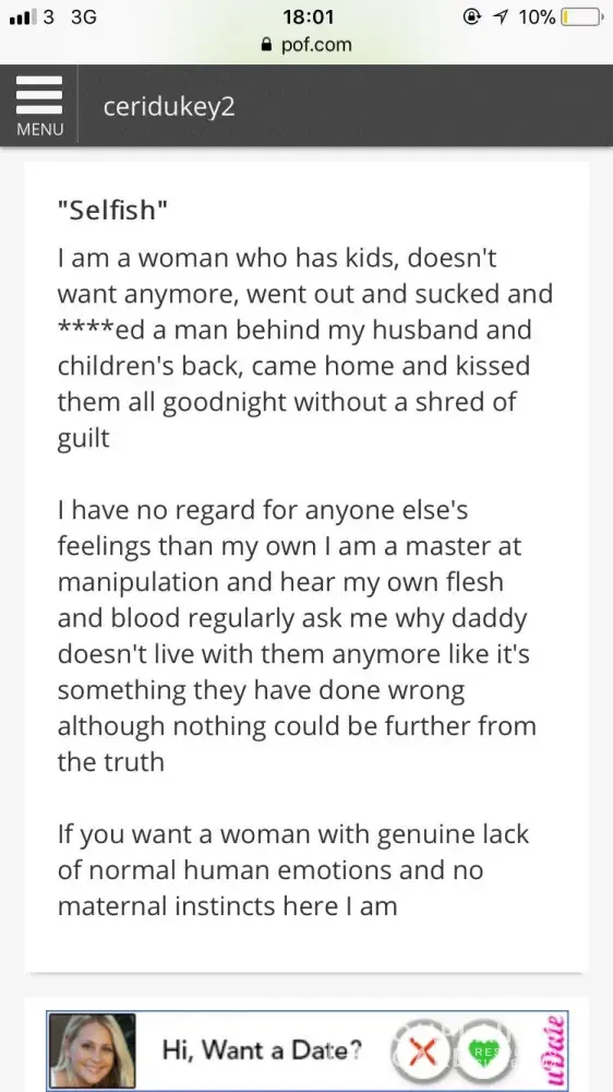 This site is without question one of the worse places to find a relationship. The vast majority of the women are totally full of crap. They write all these serious sincere intros, pretending to be genuine, saying that they dont do one night stands etc etc... Then you read their dating age starts from 25 and these women are like late forties to fifties... Erm does that contradict what youve just wrote? You arnt after one night stands but then youll date someone young enough to be your child!. Now if I was dating a woman in her twenties, they would call me a kiddie fiddler, so does that not make women gross female peadophiles... God women are such hypocrites, always pointing the finger that men lie and men think with their [censor]... Truth is statistically, women lie way more than men and are more devious and perverted than men... We do not have a drawer full of dildos because we are so greedy that a man is never enough... And rememeber guys... Fat and greedy go hand in hand and fat is a female issue. So if anyone want an std or even aids... Please try pof or tinder as tinder has double the rate of stds and aids infections in the uk on its own!... Oh and forget about ever finding and honest women... None of them can lie straight in bed and you all know that!
