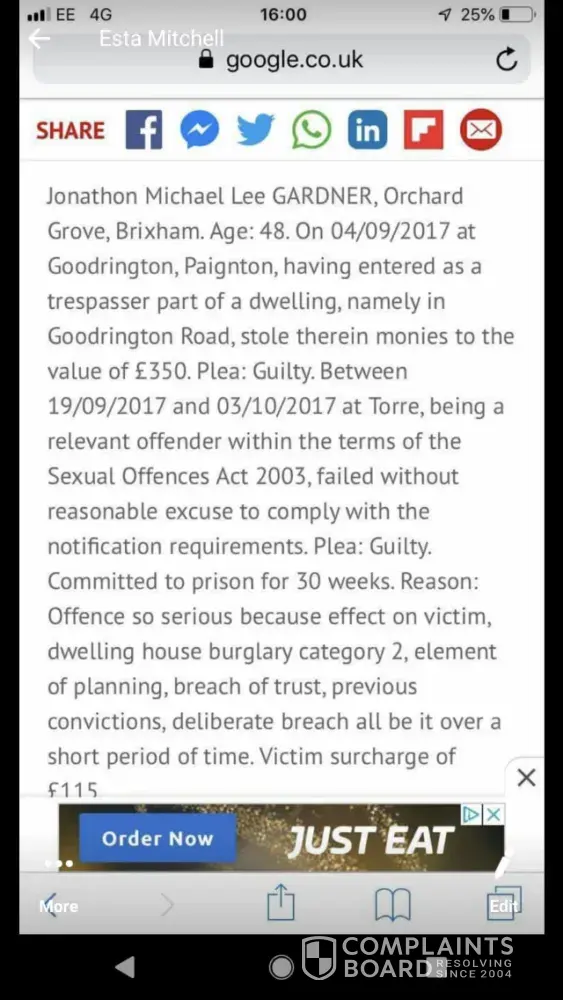 I met and dated a member of plenty of fish, after 5 weeks 3 complete strangers, one was a relative of the victim made me aware he had been in prison for sexual offences and burglary, i since found out he is on the sex offenders register!