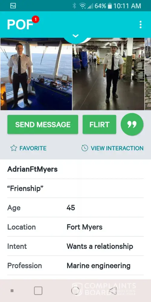 Adrian Fort Myers is his username and he is a serious imposter from the UK apparently or who knows and he is preying on women in the severest ways such as pretending to send Parcels of gifts and sending misspelled invalid information of names addresses phone numbers and using the wrong pronunciations for our US Government customs and diplomats. This has been reported to the FBI already and this is a very serious person.