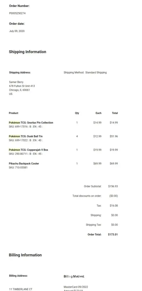 I was so excited to order from Pokemon Center, I didn't even bother to check out any reviews beforehand. I ended up spending almost $400 on my order, which was a lot of money for me. I went through the checkout process and entered all of my information, but then something strange happened. They charged my card after they switched my billing and shipping addresses. I was so confused and frustrated. If I had entered my information wrong, my purchase wouldn't have gone through. It was a really dumb mistake on their part.