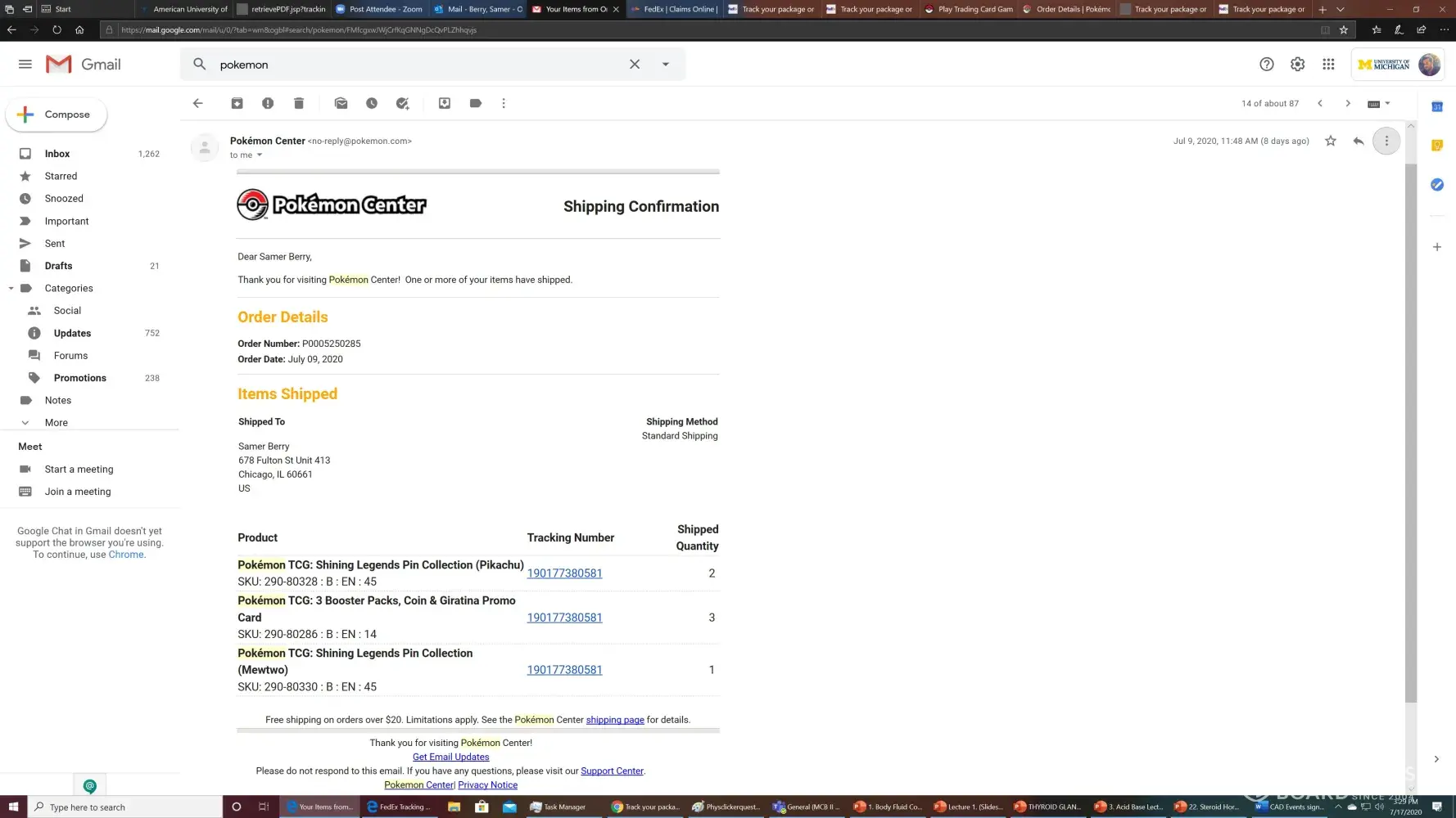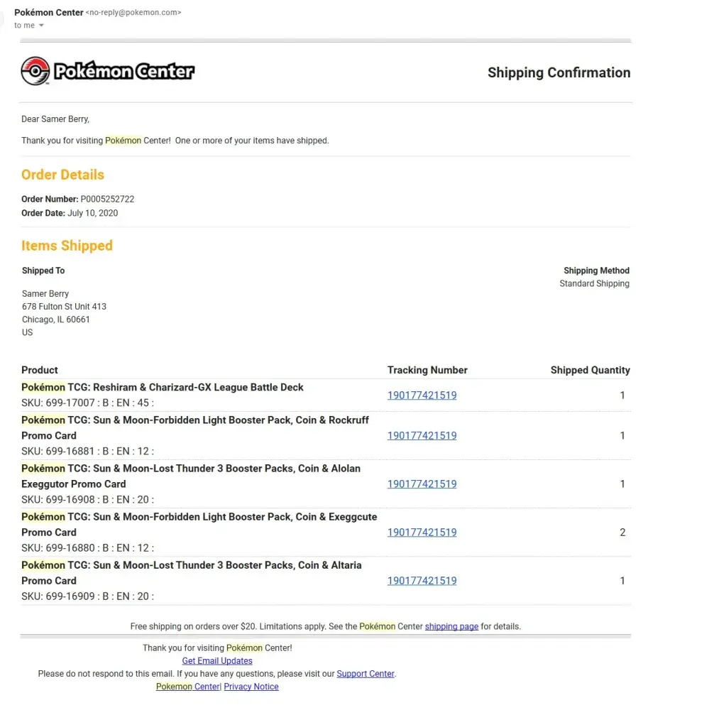 During all this, order history page would not even let me check my status anymore. The only way I knew anything was even moving was through the FedEx delivery manager, which showed 6 different shipping labels from the Pok?mon Company with no verification.