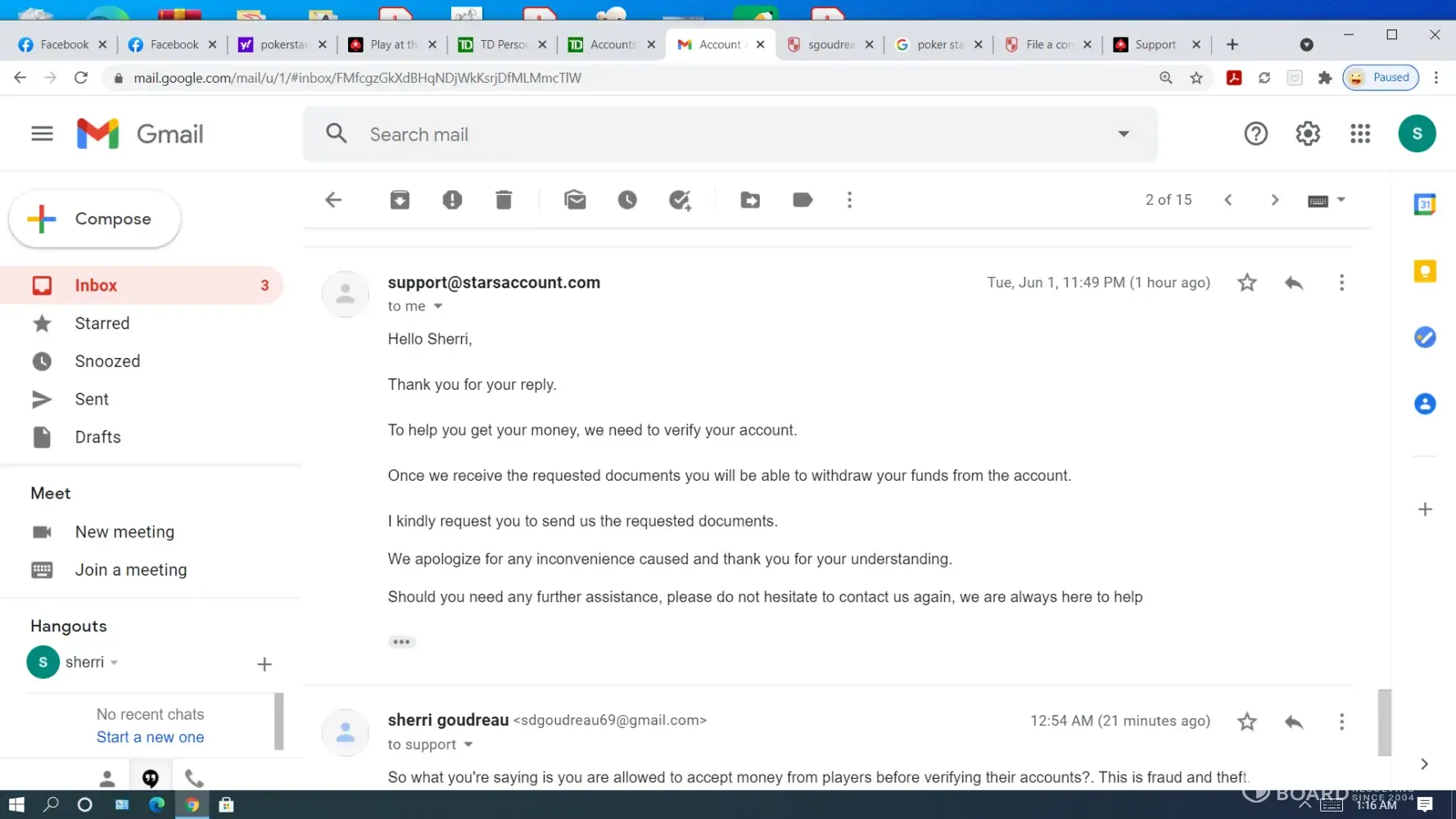 On May 31 I decided to create an account for pokerstars.com, username: sgoudreau1985. After completing the registration I then Deposited $300 Canadian funds via etransfer. Right after the funds showed up into my poker stars account I received an email from pokerstars saying "During a routine review we identified that you have a close relation to the player(s) listed 'cpare__25'". I have replied to them saying I do not know who this person is an this is unprofessional. They then sent me an email saying I can withdrawl the fund once I valadate my account. I replied with an email saying sorry but this is fraud and theft, Pokerstars allowing myself to make a deposit without verifying who I am, then not giving me access to my funds.