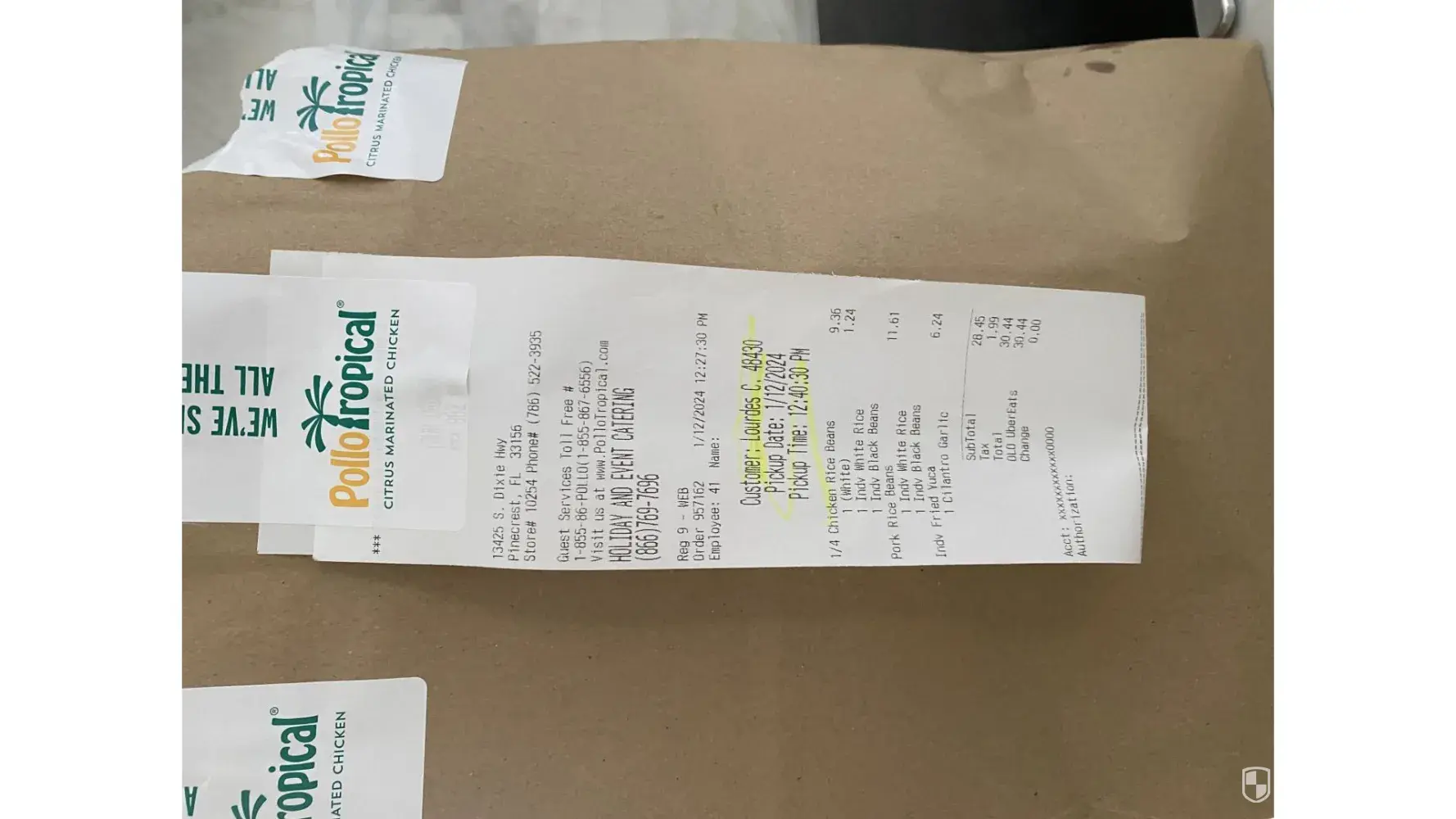 On 7/28/2023, at 1:28pm, UberEats picked up my order from Pollo Tropical at address 581 N.W. 57th Avenue, Miami, FL 33126, Store# 10030, Phone# [protected]. I had ordered 1/2 Chicken Rice Beans ($11.49) and Crispy Chi Avocado Salad ($11.99). The worker at the Pollo Tropical handling my order had failed to include the Crispy Chi Avocado Salad in the bag...