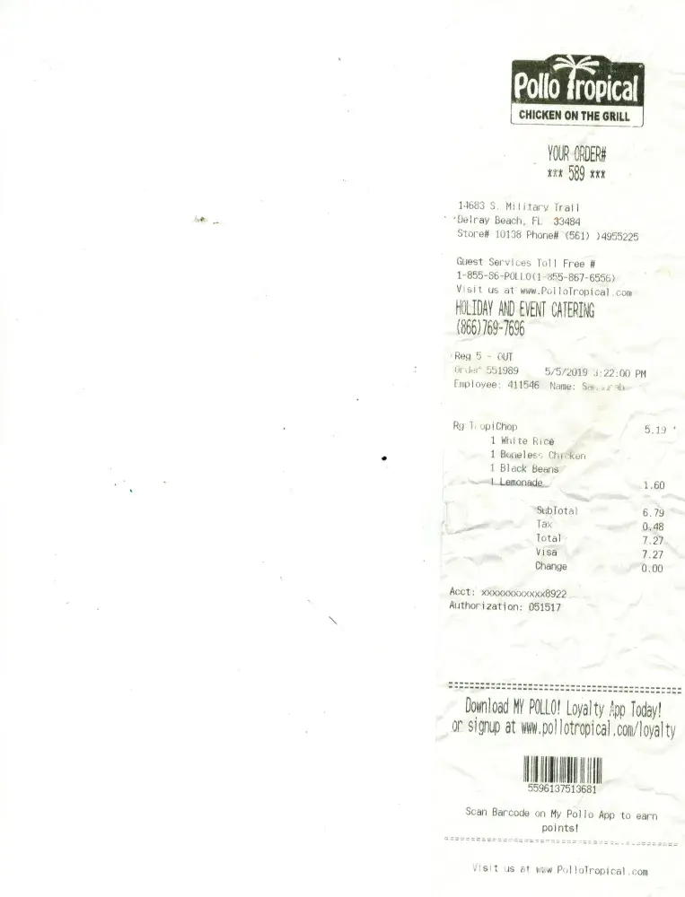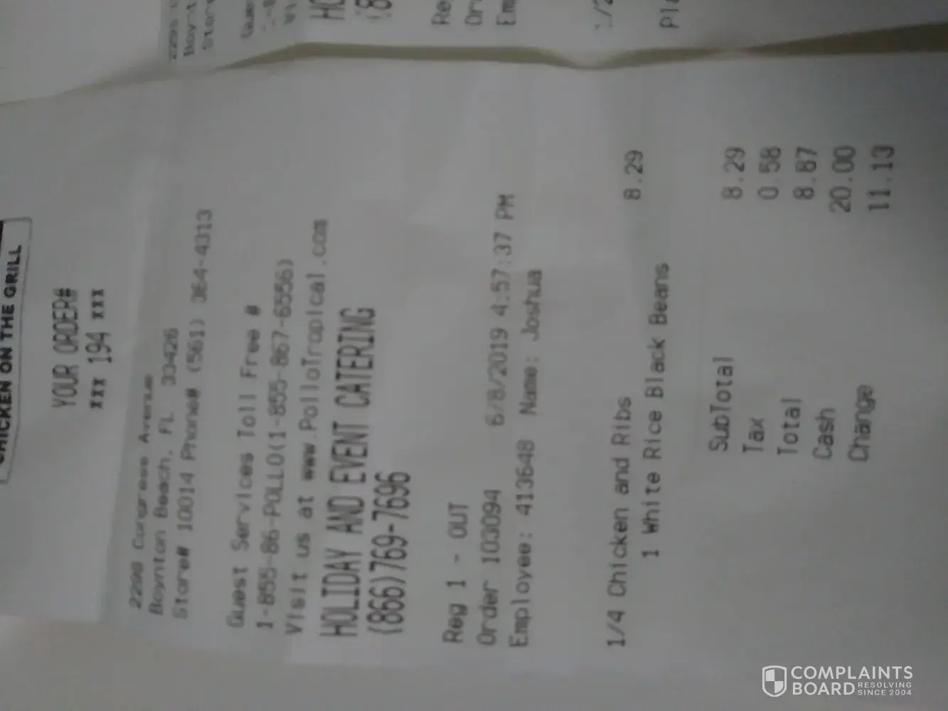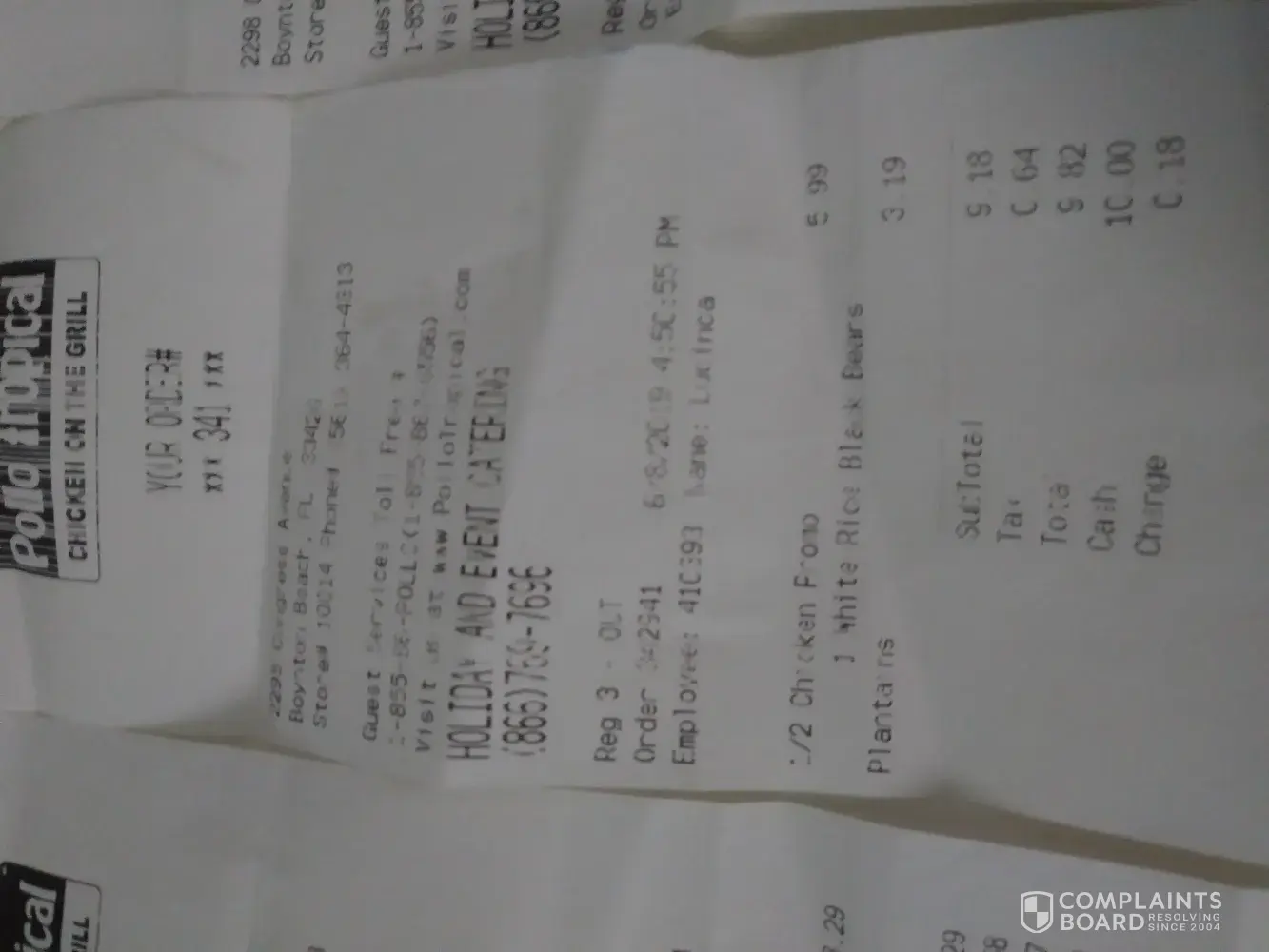 Order a tropichop White rice black beans and boneless chicken and a lemonade on May 5, 2019 at 3:22 PM After 10 minutes of waiting noticed that peoples that came after me getting there orders ask the person at the counter where is the order the Lady at the counter said where is the receipt give her the receipt she says that's not what on the screen she...