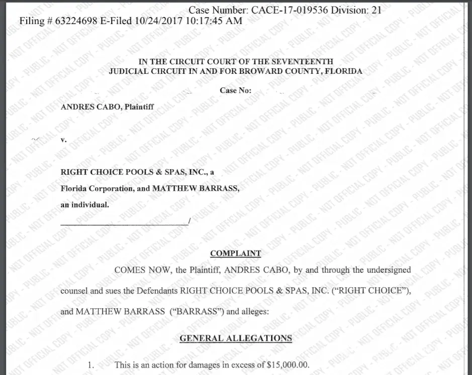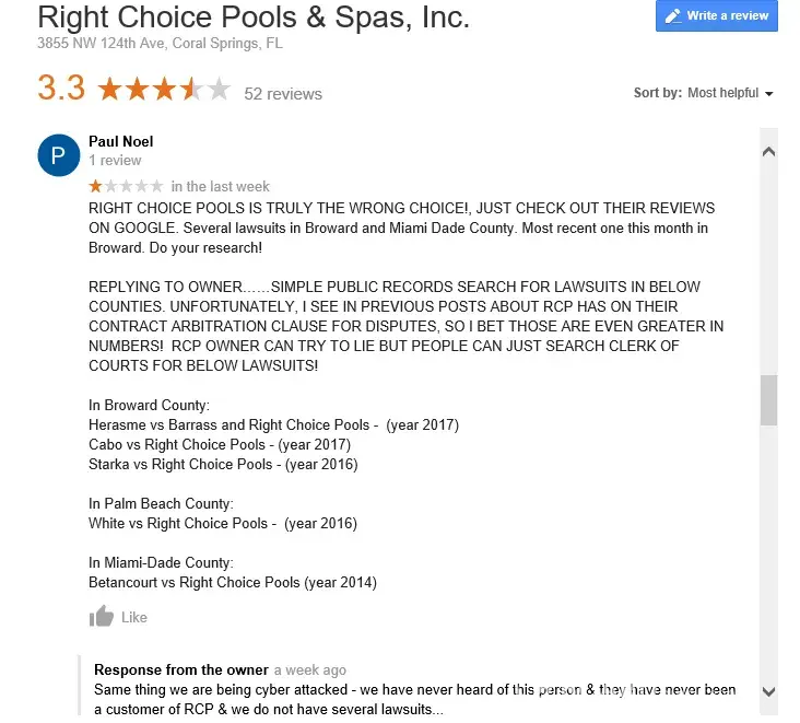Update.. Rcp brought back their main facebook (right choice pools & spas, inc.) for some reason recently, take a look for all documents and pictures. Update 12/13/17... Another lawsuit from another victim in broward county case number: cace17022438. Several this year alone! I suggest all right choice pools & spas victims post legitimate grievances here on...