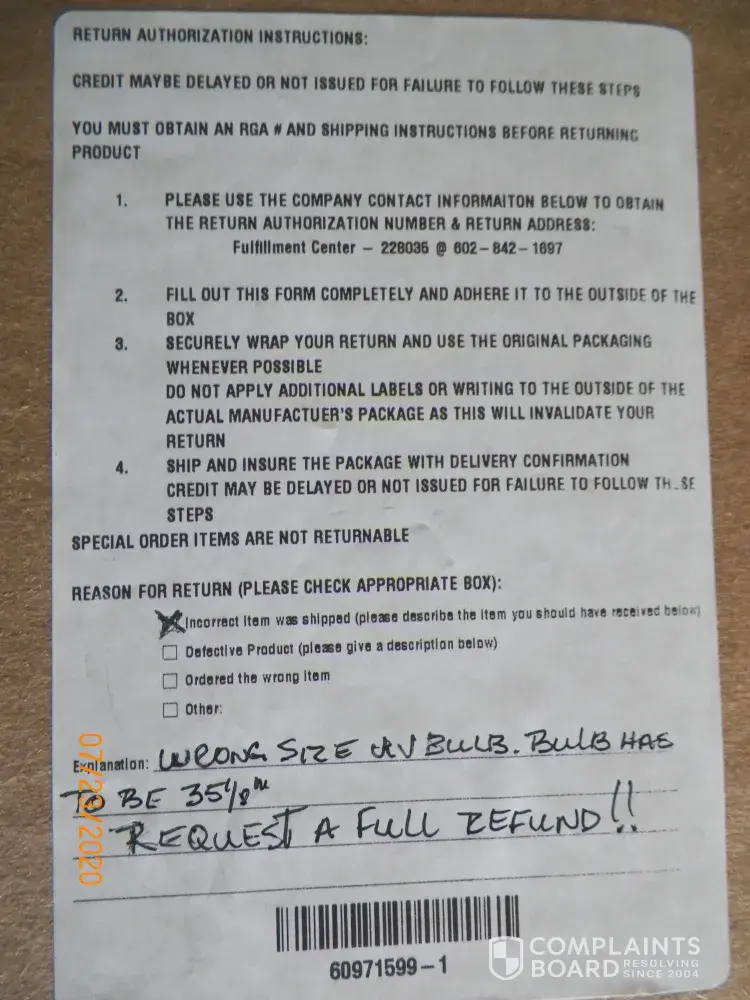 This business does not value customers they scam artists, they sell items that are incorrect and then will not issue a RMA return ticket for a full refund. I ordered a UV lamb for my Delta Elektra Pro EP-20, the bulb required measurements are 35 1/8"they send me a bulb that measured 33" over 2 1/8"to short for my system. Tom Antonson, he requested I send pictures to make sure the bulb was 2 1/8" to short, which I did even though I found it very hubris to say the least since for the past 15-years I have replaced my systems UV bulb and know what size it requires. After receiving the pictures Tom emailed me back stating that a RMA ticket would be issued in 72 hours. Then one day later on 7/17/2020 I received an email from customer care Miss Maura stating that they had 3-5 business days to issue a RMA return ticket, and after several email correspondence it became clear that they would not honor their own policy, to this day I have not receive a RMA return ticket. When I did not received any correspondence back from Pool Supply World on 7/23/2020 I send the incorrect UV bulbs back at a cost $34.96, to this day they have not excepted the return UV bulbs even though FedEx has been trying since 7/28/2020. This company cannot be trusted and are not honest brokers. Filed a BBB complaint and alerted my CC fraud department.