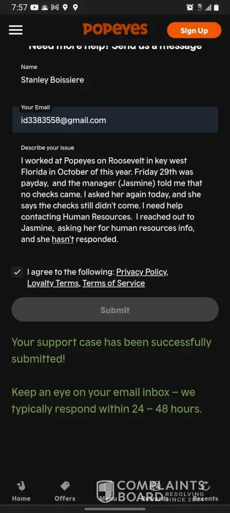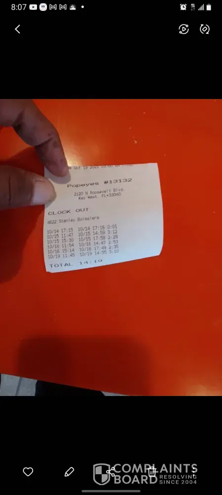 Didn't receive my Oct 29th pay from popeyes on Roosevelt in key west Florida.