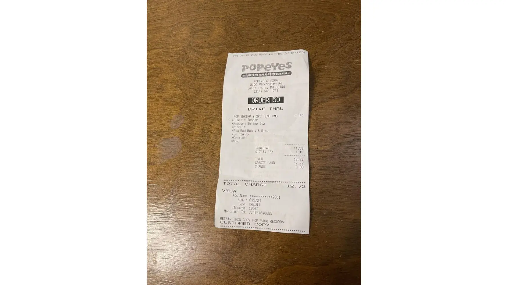 I enjoy food from Popeye's and have eaten at your store many times. But this was a terrible experience and I do not plan to eat at Popeye's again.