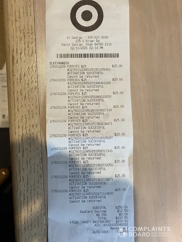 March 1, 2021 This is the second time I have sent you a complaint and haven't received a response. I purchased $250 worth of Popeyes gift cards ($25 each) from Target in St George Utah, on February 13th, 2021. Your stores will not honor them!! How can I get my money back from Target?, or from you. Target has written on the sales receipt "Cannot be...