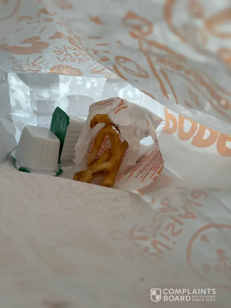 So I am not sure, who needs to hear this, but this is the first time I have ever taken the time to complain to a corporate office about the quality of their food and service. We have a few restaurants in our town and my daughter loves Popeye's. She loves your spicy sandwich and she loves your fries. She works at a place in town and goes directly to work right after school so my husband was ask to take her some food. I know that due to Covid you have to do everything through the drive-thru and its so crazy right now but I have attached a picture of the fries that my daughter received. This isn't the first time something like this has happened but it's the first to my husband who hates eating out and doesn't like for our kids to eat fast food anyway. He looked in the bag and saw the fries but the only way to say anything was to get back into line which was all the way to the road with cars so he went on. I am not sure what I am looking for from this email but I guess I feel better letting you know that this Scottsburg location is struggling. Multiple times only cash can be used and they have been out of soft drinks or something else. I called and told someone who answered the phone and she said come back and get a replacement but we live 15 min away and my daughter can leave work so it was out of the question. So maybe next time she goes through they will give her replacement fries. I guess only if they believe our story as the lady only said to tell them Dillan said she gets replacement fries. No name was taken. If you have any questions feel free to email me back. [protected]@gmail.com