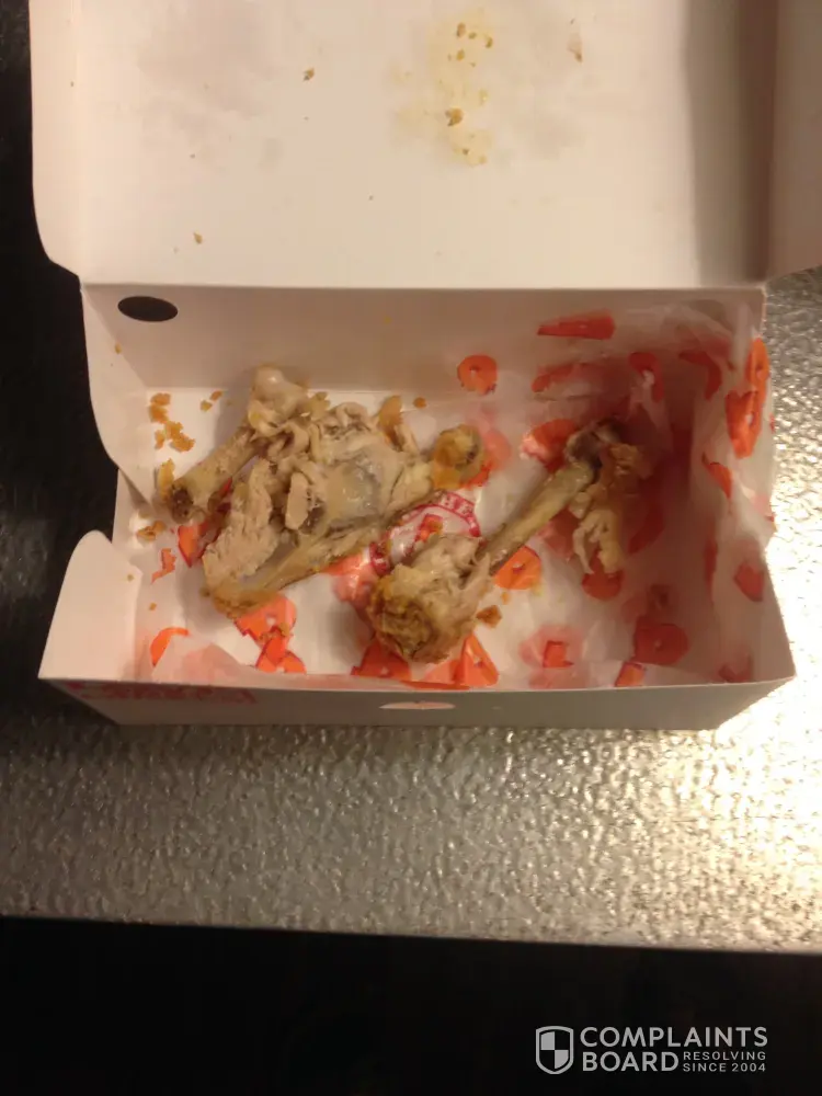 Take Out order #76, on April 9, 2019, 07:43pm Item: 16 Piece Mild Chicken Tenders Dinner Complaint: Chicken was old, cold and a dead bug was stuck on a piece that was in the middle of the box. Item: Cajun Fries Complaint: A small order of fries was placed in the box that was suppose to hold a dinner order. Item: Black Eyed Peas Complaint: I did not...
