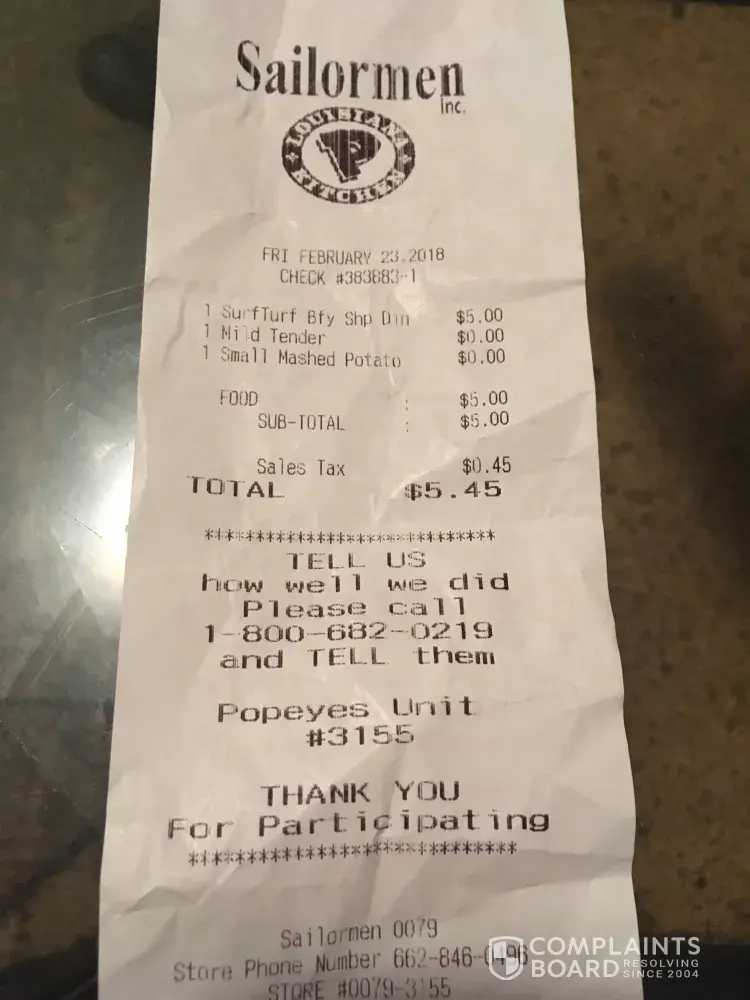 I went to Popeyes and ordered the SurfTurf Shrimp Dinner with potatoes and a biscuit. The biscuit was hard as a brick on top and wet on the bottom. Then I called back to complain and they( the employees) were just yelling that biscuit was not wet and he told me to bring the biscuit back after I had made it home 12 miles . I said no he said well just call the number on the back of my receipt. Every time you go there they will never fully complete your order it's something always missing.