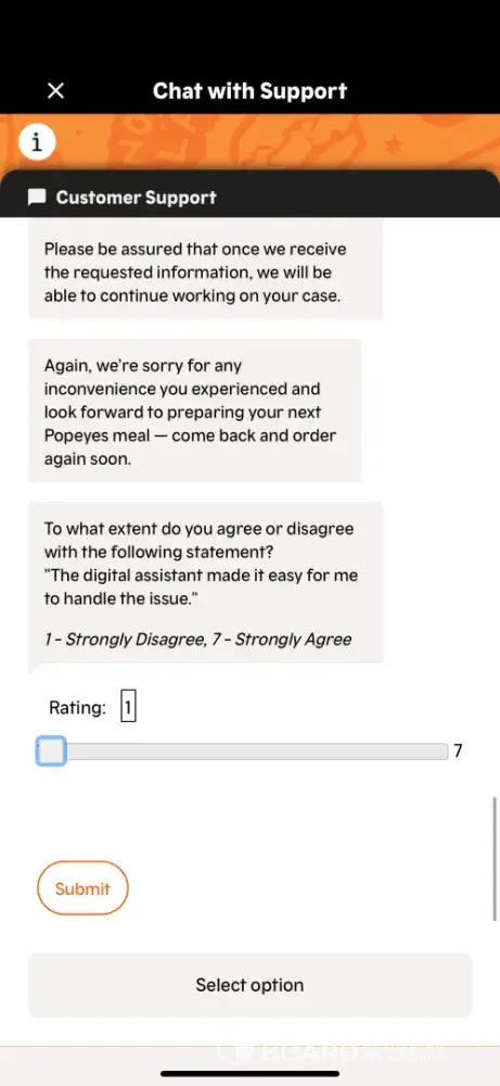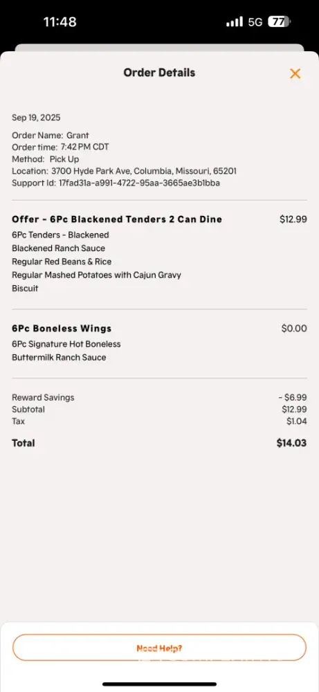 Never received my food. An employee gave me the wrong order, I told them it was wrong and they told me contact support on the app since it’s a mobile order. When I contacted support I was stopped by Popeyes AI chat bot that refused to assist me. Contacted support via email and got no help. I filed a charge back with my credit card.