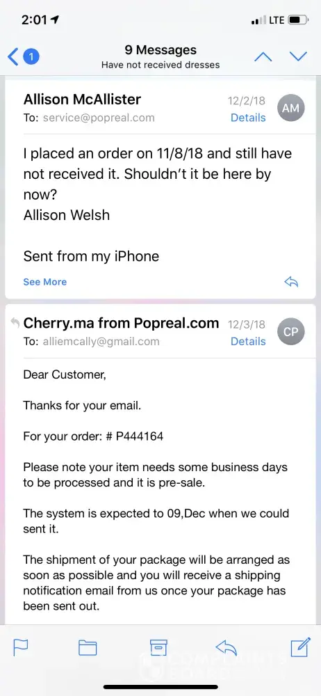 I placed an order that contained 51 items June 2018. Pop real shipped 6 of the 51 items August 2018. In September I began inquiring about remaining missing items. As of January 9 2019 Popreal has not responded. They sent numerous emails to alert me most items were not in stock but still no refund. I have tried contacting them through my financial institution and they provided tracking information for the 6 items and refused to issue a explanation or refund for over $300 worth of never shipped merchandise. I now have to pursue legal dynamics to get my money.