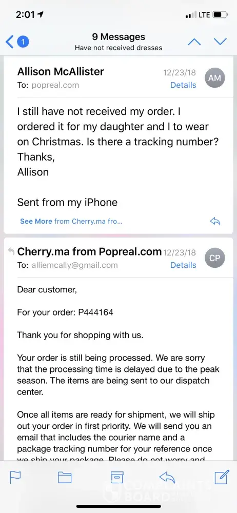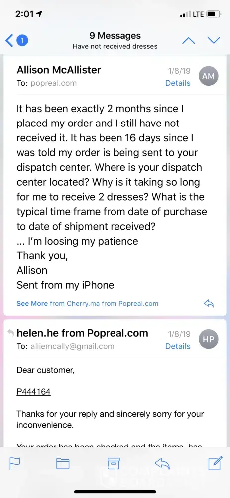 I placed an order that contained 51 items June 2018. Pop real shipped 6 of the 51 items August 2018. In September I began inquiring about remaining missing items. As of January 9 2019 Popreal has not responded. I have tried contacting them through my financial institution and they provided tracking information for the 6 items and refused to issue a explanation or refund for over $300 worth of never shipped merchandise. I now have to pursue legal dynamics to get my money.