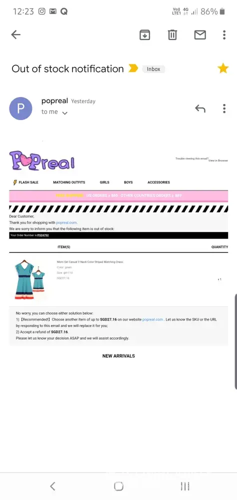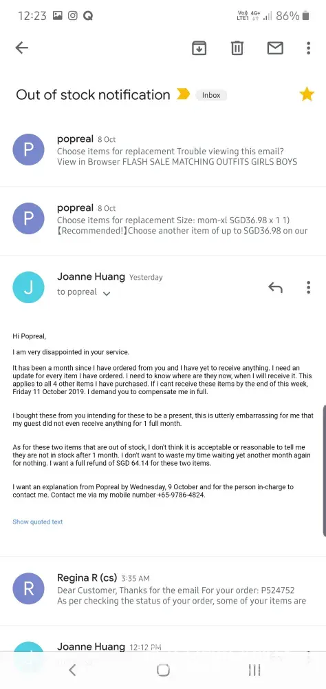 Next, I received an email providing options to choose another item or accept refund for item that is out of stock. I think its ridiculous that your team only inform me about the out of stock situation after 1 month. And after replying that I want refund, your customer service staff asked me to choose a replacement. I want a refund, I am not going to waste my time waiting for months for these 2 pieces.