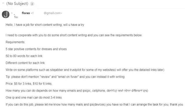 They contacted me through my blog asking me to write fake 5 star reviews for $5. I have refused this offer several times since last year but they are persistent using different email addresses every time. Sometimes they send a request for "Content writing opportunity" but if I ask them the details they sent me instructions per attached files.