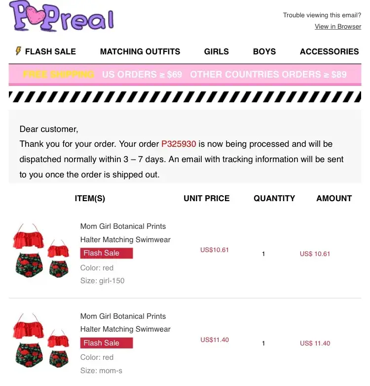I'm going on vacation and wanted to get a cute bathing suit set for my daughter and mysel. This company was advertised on Facebook. The styles were very cute and inexpensive, so I ordered on March 15 and never received a shipping confirmation even after almost a month. I complained and they apologized for the delays, but still to no avail I had a feeling I would never get my stuff. I canceled and asked for a refund and they told me to choose another item from the website. I just wanted a refund so they said I should see a refund soon. Didn't happen. Finally, I called my credit card company and got my money back.