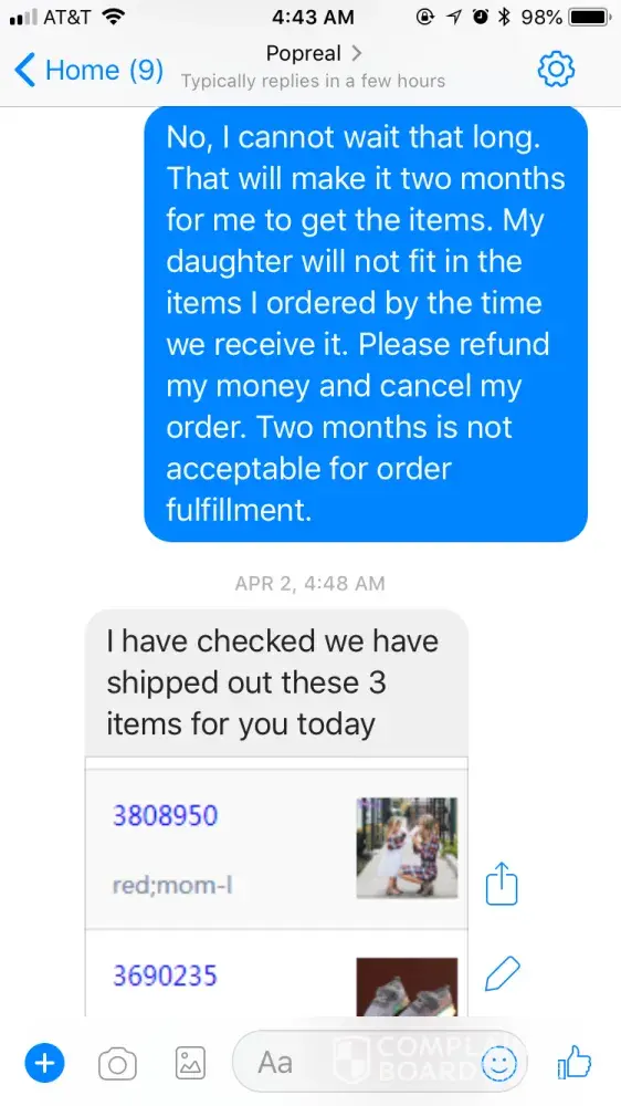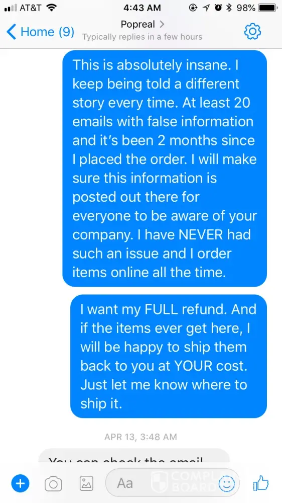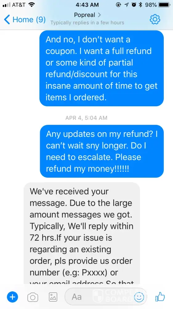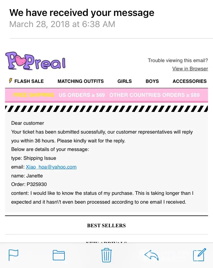 They don't update your order status on the site. (Even now, after receiving items, it shows them as being paid for, but not sent.) I tried calling the number posted on their site-it's only an outgoing message. I emailed multiple times. The two times I did receive a response to my emails 1) I was asked to be patient because two items were on backorder AND that they were slower than usual because of Cineese New Year (mind you the website claims to be in England); 2) then they sent a tracking number that didn't work. In the second response they asked me to stop emailing them. PayPal stepped in threatening Popreal a reversal of charges if I didn't receive my items by a certain time. I received an email asking me to remove my claim so that they "can send the rest." As advised by PayPal, I did resond.