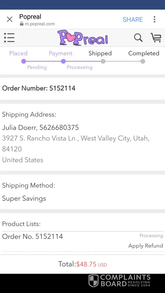 It's been 26 days since payment confirmed (AUD$133 order no.P212057) but no sign of when will i receive my order! Popreal sent 2 emails confirming my payment & complaint, but that's it! Tried to track through its email & app, impossible. Should i call the bank to cancel the trx and report Popreal? They seem to not care of growing dissapointed customers.