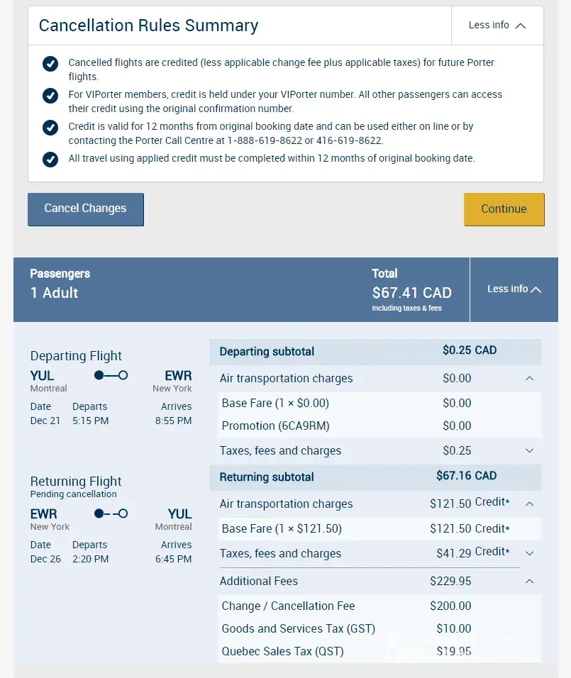 I have made a mistake in the dates for a round-trip flight from Montreal to New York (and that's on me), however what's unacceptable is that changing dates would cost more than the actual flight price, even after applying their laughable "credit". Not only that, canceling the flight would end up with me being charged instead of given a reimbursement/rebate! I understand the need to apply fees in this kind of situation, but they should be next to none considering I've booked this flight over two months in advance.