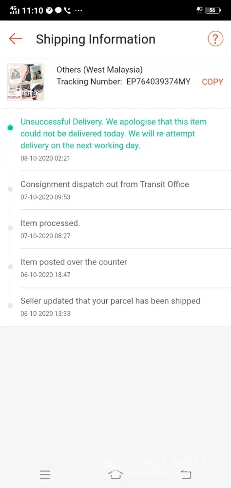 "my parcel supposed to be sent on last wednesday which is on 7th october, but they didnt. They even remarked to re-attempt delivery on next working day and till today my parcel is still at pos laju seremban, I am not sure if they attempt to send my parcel before because there is no calls from their staff nor they didnt leave any ar card for me to collect the parcel at their branch. Since I am outstation I cant even collect the parcel from the main post office. Kindly applying to reschedule my delivery, here I attach the details of my parcel.