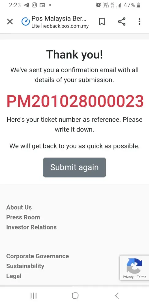 Selamat petang, tujuan saya mengemukakan report ini bagi mengadukan permasalahan pihak poslaju Sungkai Perak